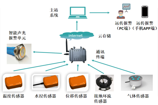 電纜井綜合環(huán)境監(jiān)測(cè)系統(tǒng)主要通過通過2.4G無線自組網(wǎng)通信集成傳感器采集實(shí)時(shí)數(shù)據(jù),利用NB-ioT物聯(lián)網(wǎng)通信以15-240分鐘一次(可設(shè)置)的頻率向云端發(fā)送數(shù)據(jù),后臺(tái)主站再對(duì)云端數(shù)據(jù)進(jìn)行整理挖掘并解析及顯示,在有報(bào)警觸發(fā)的情況下主站以語音、短信、聲光報(bào)警方式進(jìn)行實(shí)時(shí)報(bào)警。