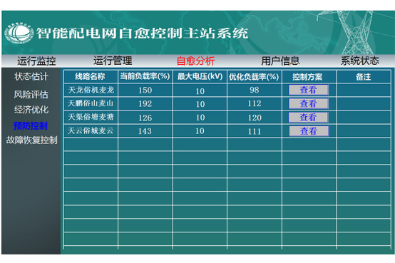 智能配電網(wǎng)自愈控制主站軟件通過智能終端設(shè)備或現(xiàn)有配電自動(dòng)化系統(tǒng)對(duì)配電設(shè)備和分布式電源運(yùn)行狀態(tài)的實(shí)時(shí)采集、與現(xiàn)有調(diào)度自動(dòng)化系統(tǒng)的信息交互實(shí)現(xiàn)整個(gè)智能配電網(wǎng)的可感知,對(duì)配電網(wǎng)異常運(yùn)行情況如線路負(fù)荷越限、母線電壓越限、變電站出口開關(guān)跳閘或保護(hù)動(dòng)作給以判斷和報(bào)警,即實(shí)現(xiàn)智能配電網(wǎng)“自我感知”